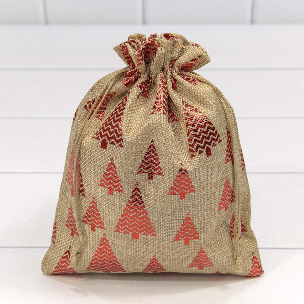Мешочки из искусственного льна 18*23 с рисунком Ёлки красный