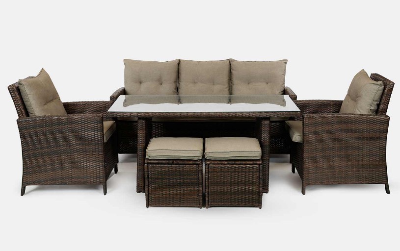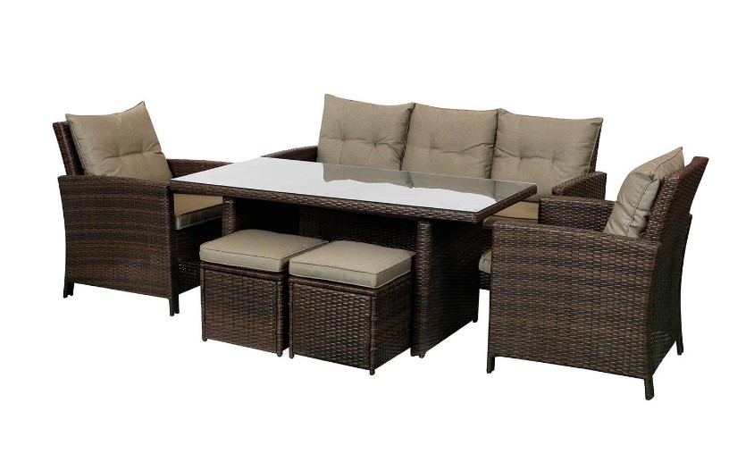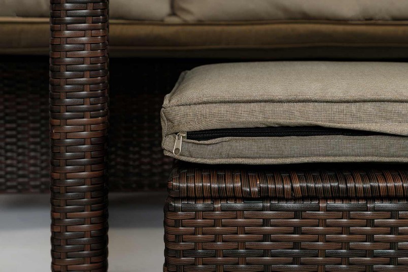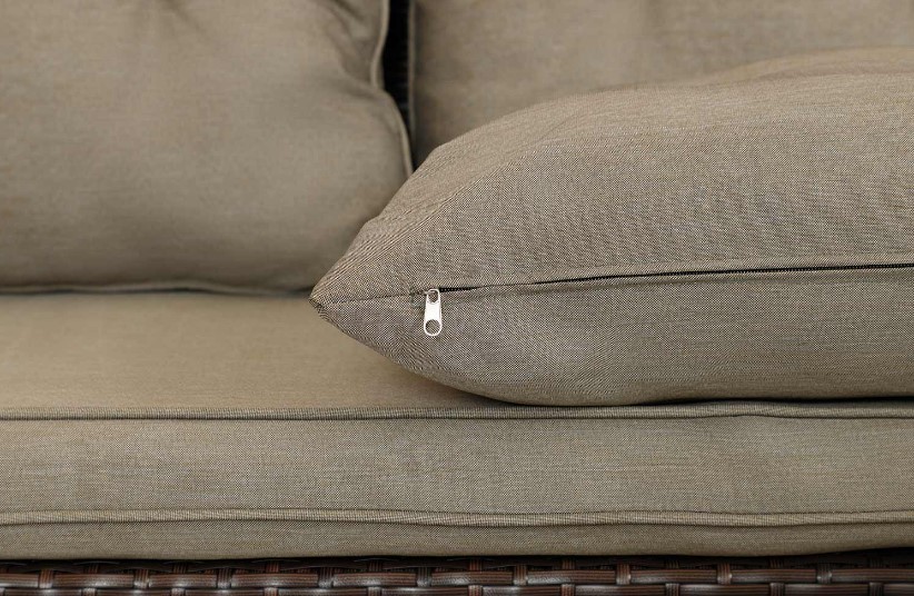 У нас вы можете приобрести подушки, предназначенные для комплекта садовой мебели, в комплекте находится большая подушка для сидения размером 153 на 55 см и толщиной 6 см, две подушки для сидения размером 51 на 55 см и толщиной 6 см, две подушки для сидения размером 40 на 40 см и толщиной 6 см, а также пять подушек для спины размером 51 на 41 см и толщиной 15 см. Все они имеют светло-коричневый цвет и изготовлены из такого материала, как полиэстер.