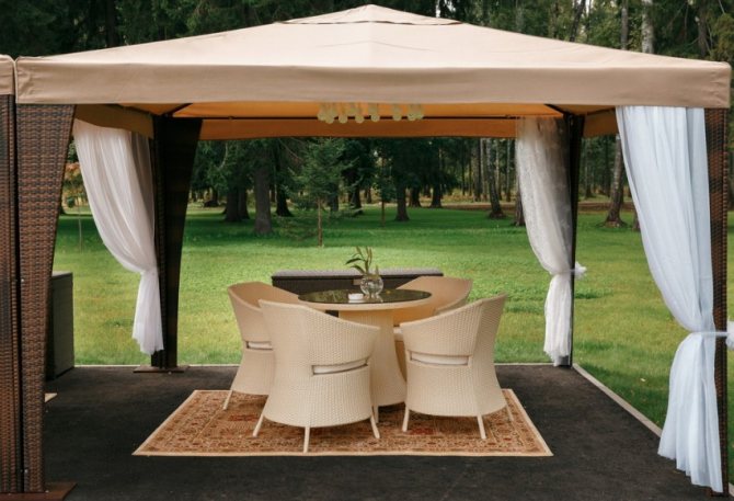 Прежде всего, материал должен быть непроницаемым для влаги, так как под тентом часто устраивают мероприятия с мебелью и столами. В случае даже незначительных протечек во время плохой погоды возникают серьезные проблемы.