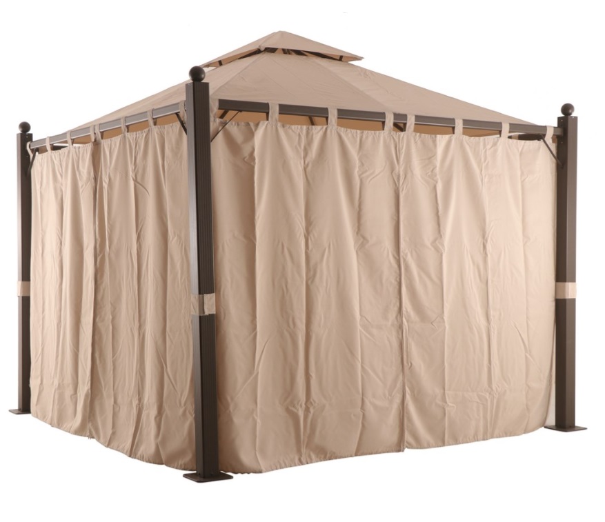 - Шторы в количестве 6 штук, на каждую сторону шестигранной беседки. Их размер – ширина 175 см, высота 195 см. существует возможность увеличить полотно до ширины 200 см, высоты 220 см, но эта опция требует уточнения у продавца;