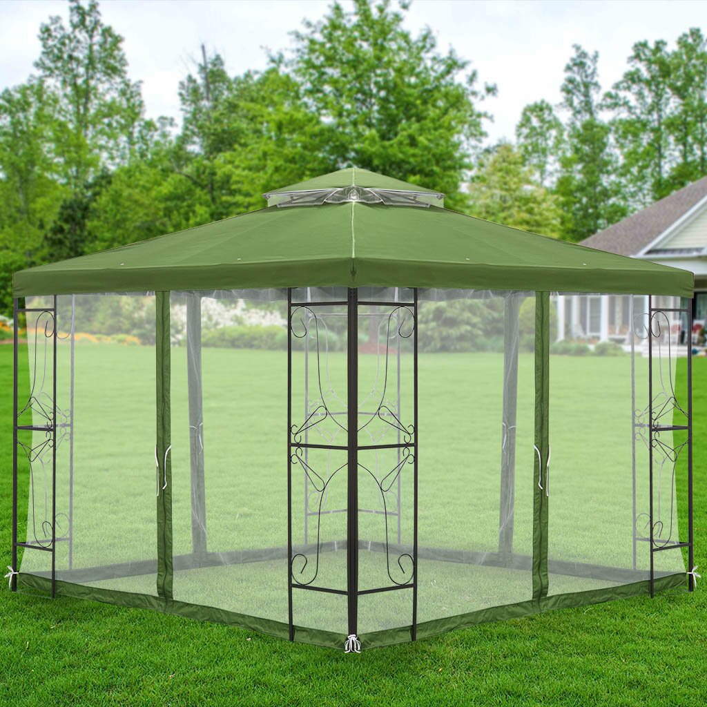 У нас вы можете приобрести комплект, предназначенный для четырёхугольного шатра с двойной крышей Green Days. В комплект входит тент с вентиляцией, москитная сетка, а также стены, выполнен комплект в зелёном цвете. Комплект подойдёт для шатра, размер которого составляет 3 х 3 х 2,65 м. Крыша изготовлена из полиэстера с покрытием РА и плотностью 180 г, а стены из полиэфира с плотностью 140 г, сетчатые стены с молнией.