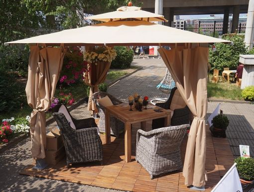 Это тент-шатёр GHGMKG014, выполненный в восточном стиле, такой шатёр является двухъярусным. Для изготовления крыши использовался такой материал, как водонепроницаемый полиэстер, имеющий плотность 180 г. У такого шатра бежевый цвет, вес 63 кг, размер составляет 300 х 300 х 260 см. Для того, чтобы приобрести данные изделия, вам просто нужно добавить в корзину необходимое количество позиций и оформить заказ.